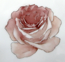 「滴のあるバラ」のメインの花の第1焼成です。テキストの下図はかなり細かいですが、実際には画像のようにラフな状態で描き、焼成を重ねるごとに細かく描写します。下の「アンティークカラーのバラ」と違い、まず花の全体を塗って、抜きながら形を整える手法です。 抜く方法は2通りご紹介しています。前半の1分(太い筆を使っている箇所)は外側の花びらなので、あまり強く抜きません。筆の角で色を切ってぼかす方法です。後半の1分(小さい筆に持ち帰る箇所)は花心に近い花びらを抜く時に用います。花心に近い側は筆を横にスライドさせ、180度ひっくり返して、筆で押し出す動きをします。この動きによって絵の具の溜まりが出来て、花びらのめくれた雰囲気が出来ます。また、押し出す筆使いによって、くっきりと絵の具を抜く事が可能です。アメリカンスタイルのバラ特有の独特の筆使いの1つです。